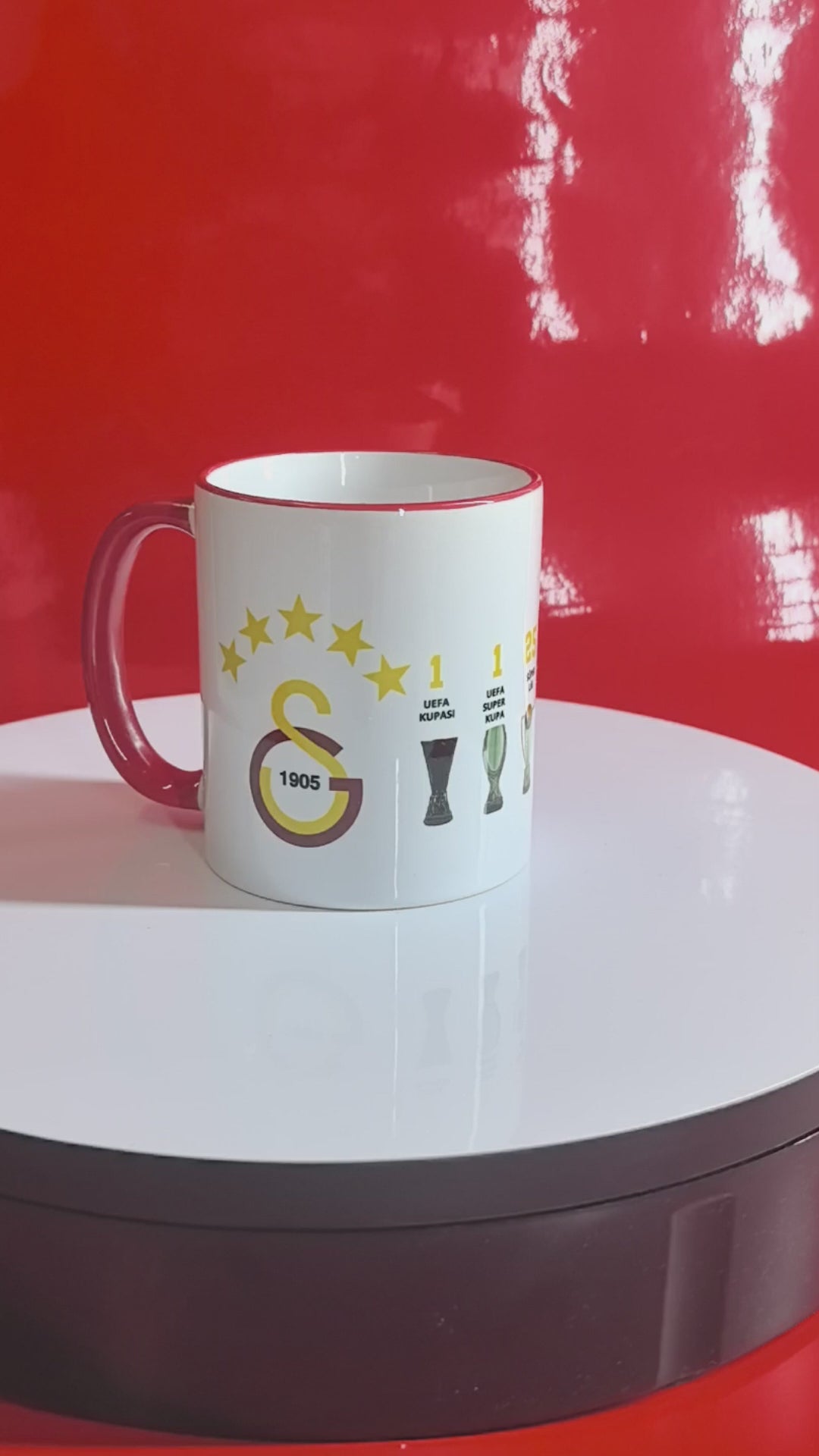 Auf der Rückseite sind die wichtigsten Titel grafisch dargestellt: 1x Weltpokal 1x UEFA Super Cup 25x Süper Lig 19x Türkiye Kupası 17x Türkiye Süper Kupası Die rote Henkel- und Randfarbe verleiht der Tasse einen lebendigen, sportlichen Look