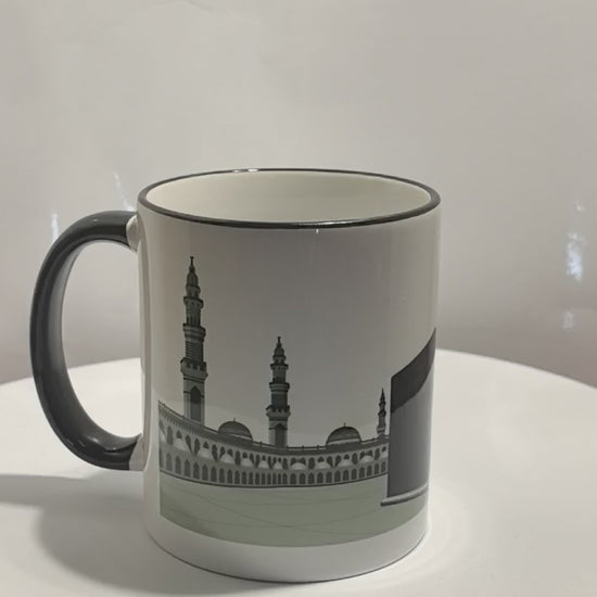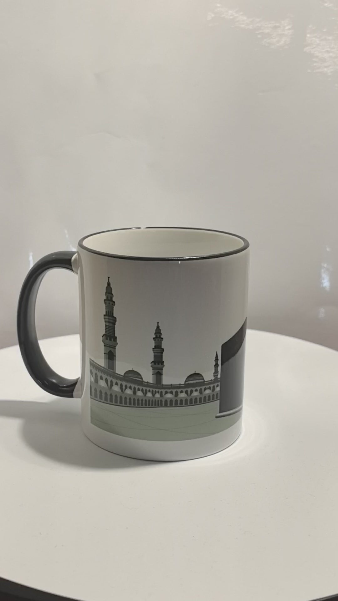Diese elegante Keramiktasse zeigt die Kaaba – das heiligste Bauwerk des Islam – mit feinen goldenen Details und architektonischer Präzision. Die monochrome Gestaltung mit schwarzem Henkel und Rand unterstreicht die spirituelle Tiefe des Designs.