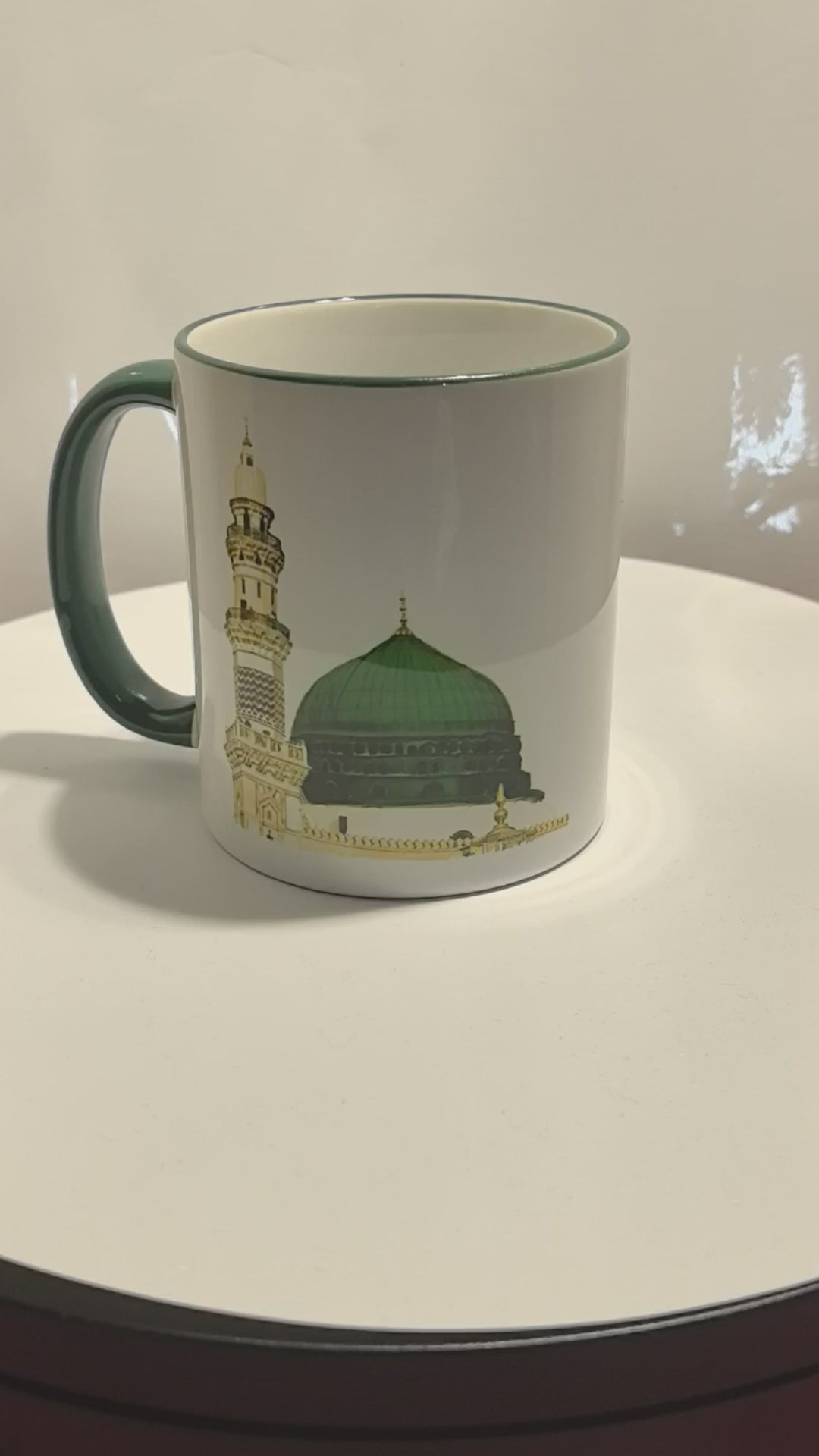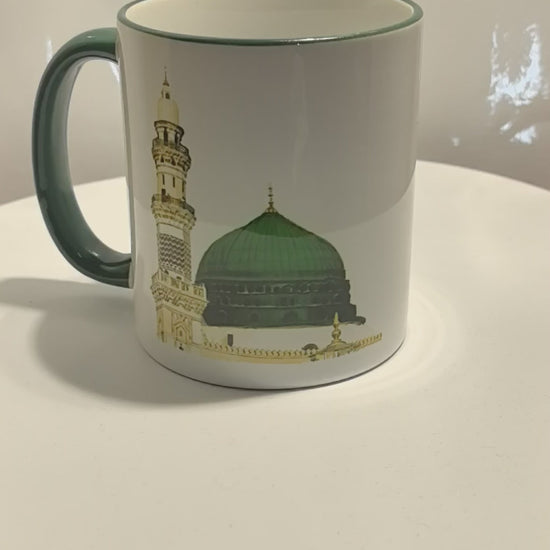 Diese hochwertige Keramiktasse zeigt die ikonische Prophetenmoschee (Al-Masjid an-Nabawi) in Medina – mit grünem Henkel und kunstvoller Illustration von Kuppel und Minarett. Ein Symbol des Glaubens, das jeden Morgen spirituell begleitet.