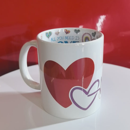 Romantischer Innenprint: Die Innenseite ist mit einem "LOVE"-Motiv und dem Spruch "All you need is love" bedruckt, das erst beim Trinken sichtbar wird.