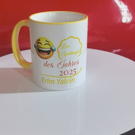Spaßvogel des Jahres – Personalisierte Tasse mit Emoji - Wunschname – Lustiges Geschenk für Freunde & Kollegen